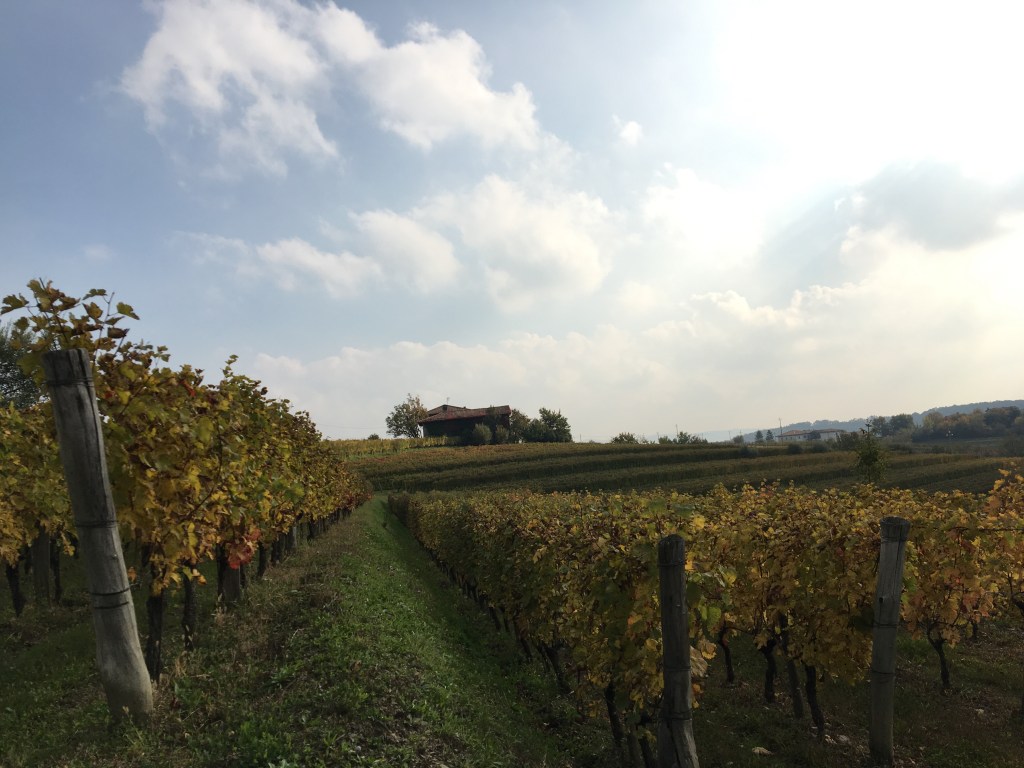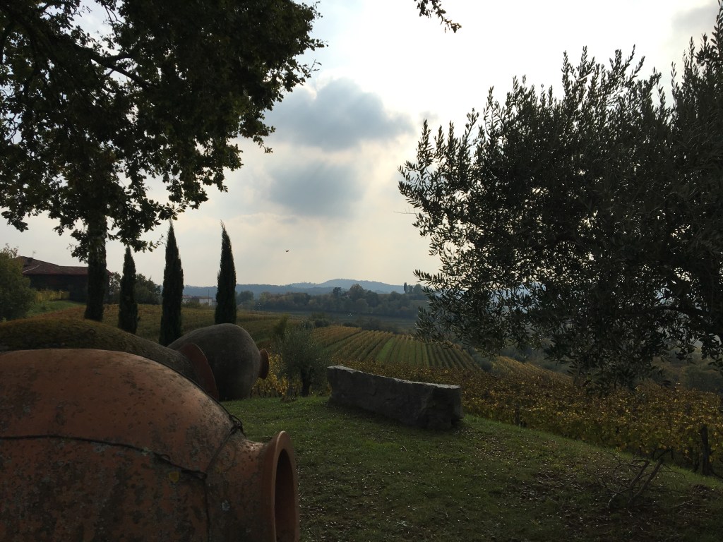 Le vigne di Ribolla insistono sopra una collina terrazzata, il terreno è scuro, le foglie sono brune e in cantina le vinacce ancora ribollono nella anfore interrate.