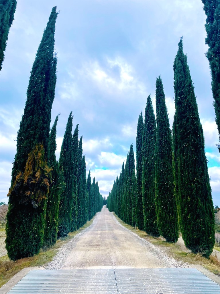 Ci accoglie un viale cipressato, quelli in cui è impossible non fermarsi a fare una foto e ci indica che siamo sulla retta via, di li a poco saremmo arrivati a destinazione.