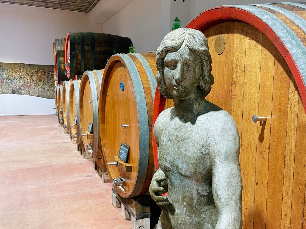 La visita in cantina è un susseguirsi di botti in stile tradizionale e tonneaux (mai di primo passaggio e con tostature leggere per non coprire il frutto) alternate a sculture del padrone di casa, quasi a creare un’atmosfera onirica, dove il vino mentre riposa per osmosi può al contempo assorbire bellezza.