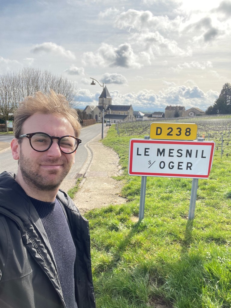 “Le Mesnil sur Oger, mon village come dice lui ha il suolo con il più alto strato di gesso, i vini qua dice che sono shy and racy, cioè timidi e affilati come una lama.